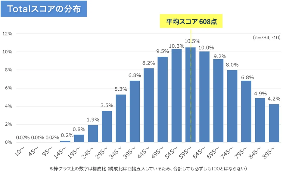 まずはこちらのグラフを見てください。TOEIC公式が発表している、テスト1回の得点者の分布です。
